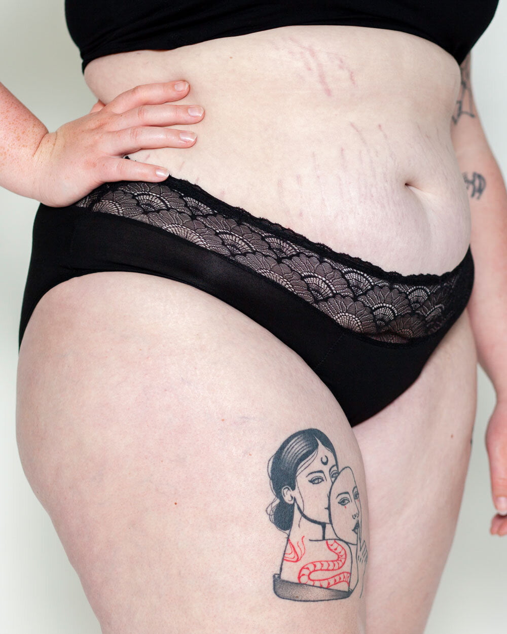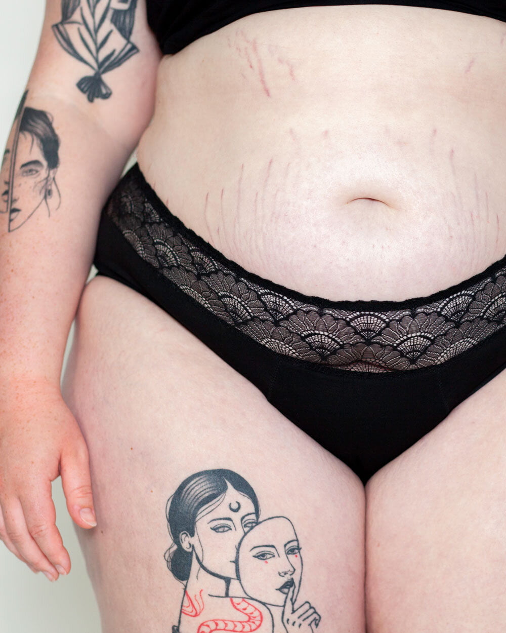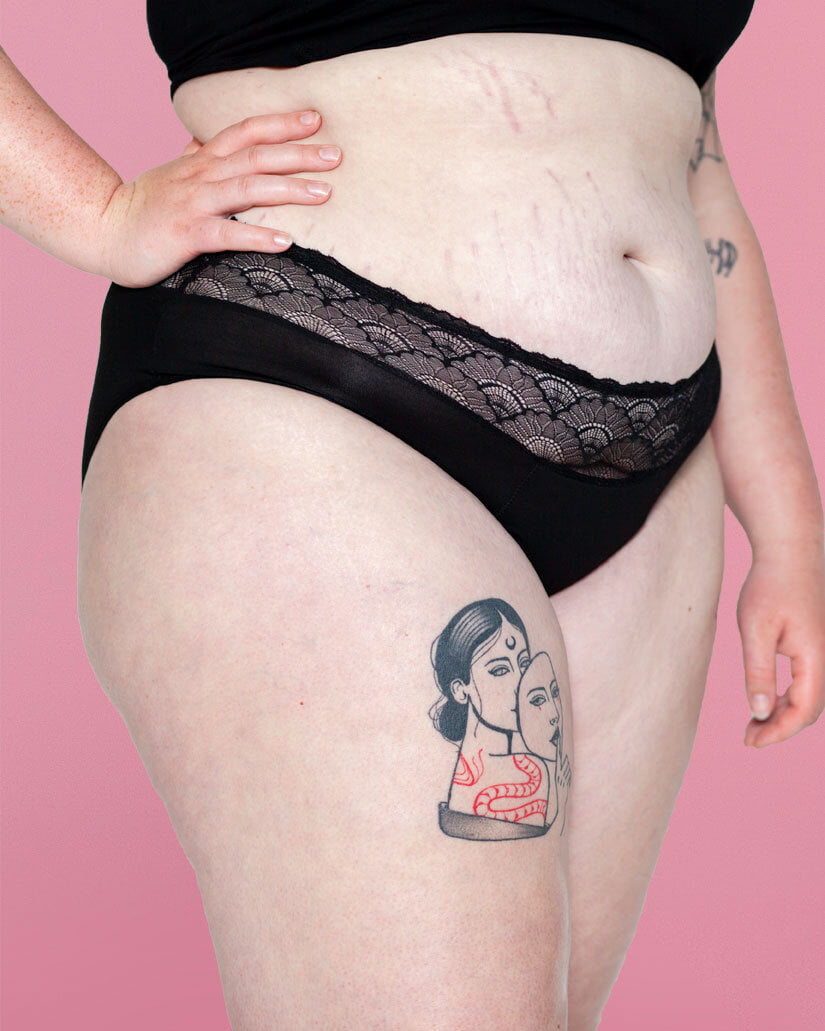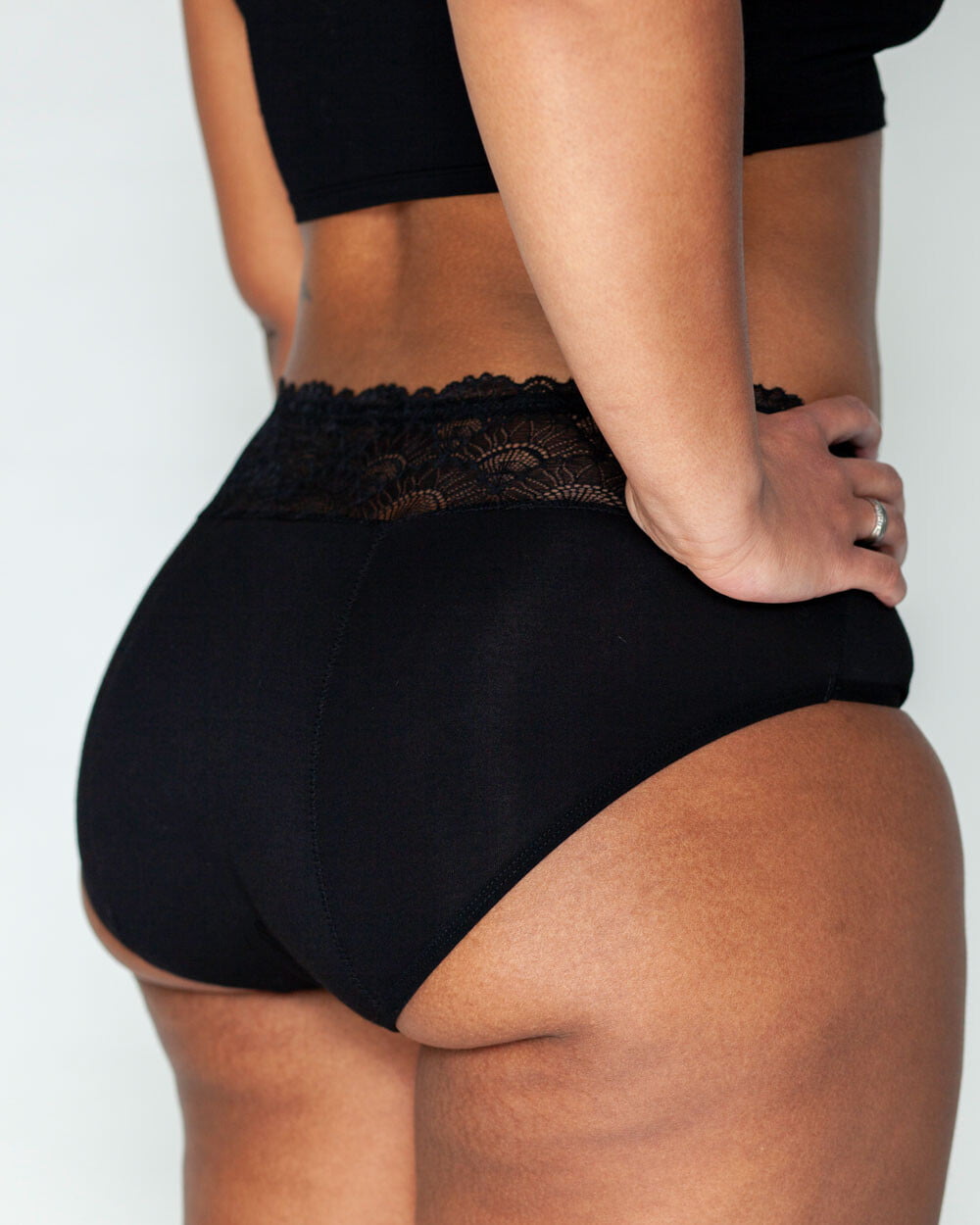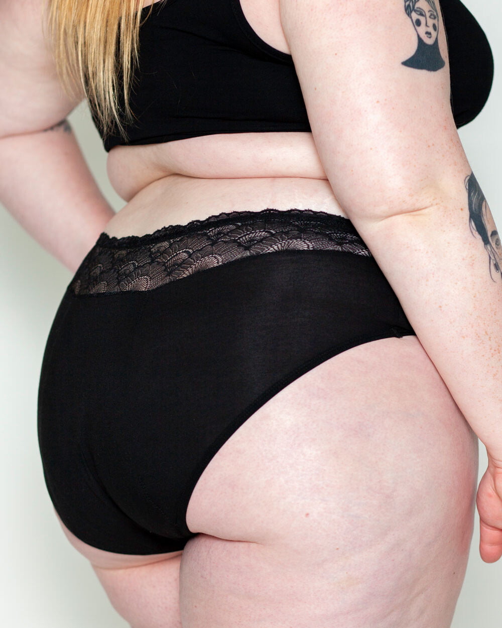 The Lotties High-Waist is a bamboo textile brief with a wide lace trim. The brief falls higher in the waist, just below the navel. The slip takes 20 ml, about 3 to 4 tampons of liquid. The slip is suitable for a heavier flow and ideal for nighttime.